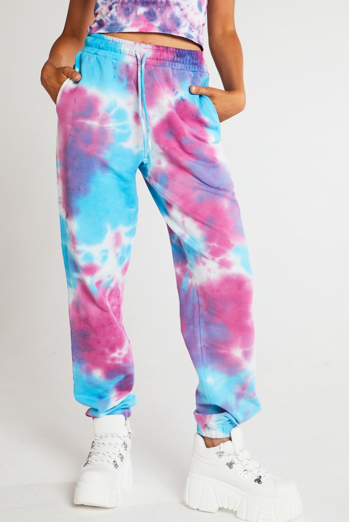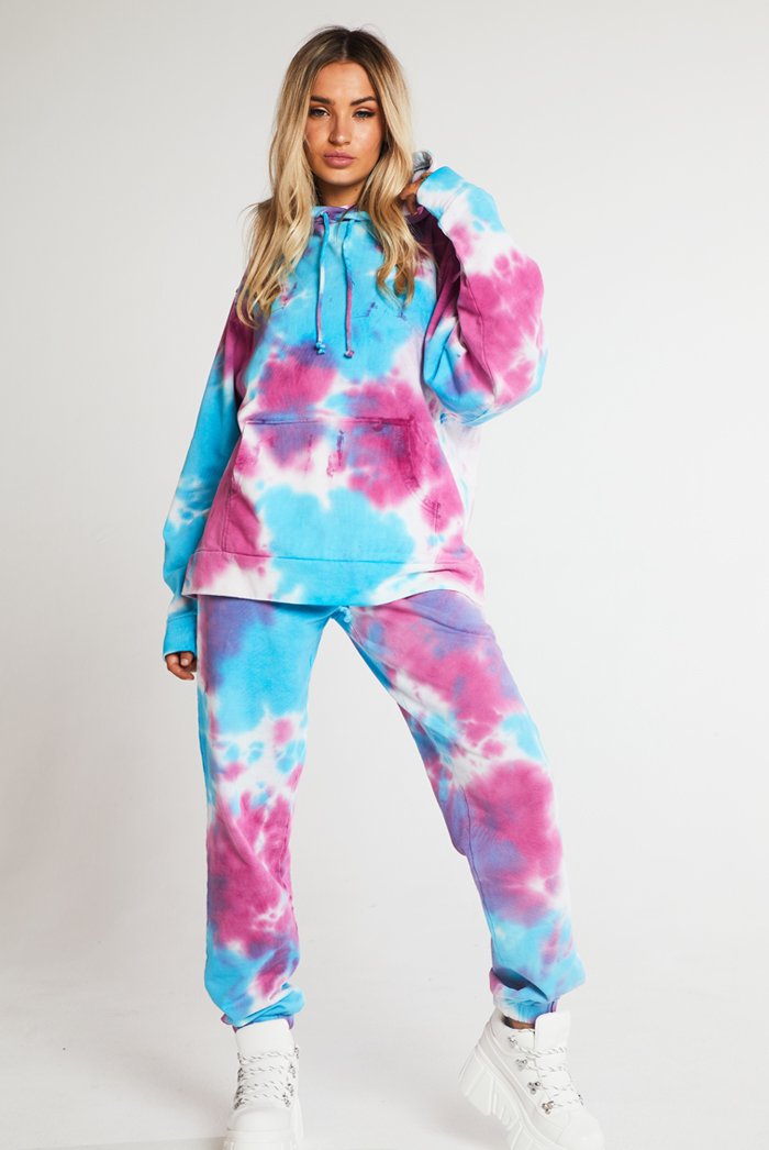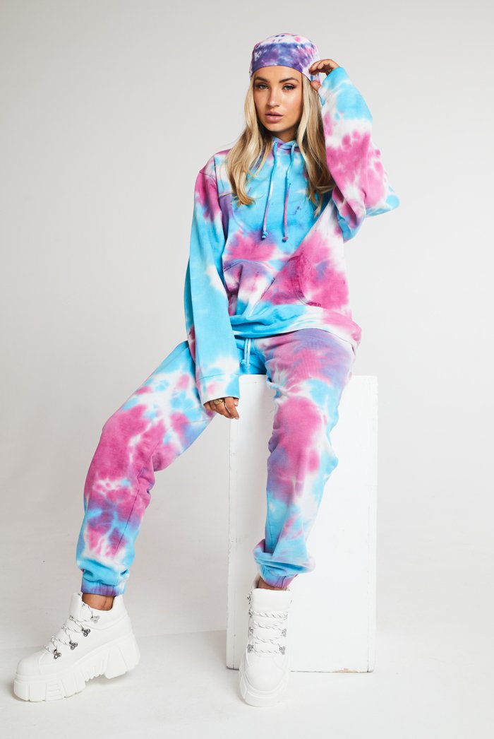 %text-1-start% Add some colour to your wardrobe this season rocking our purple & blue oversized tie dye joggers! Pair with the matching hoodie for the ultimate co-ord.
