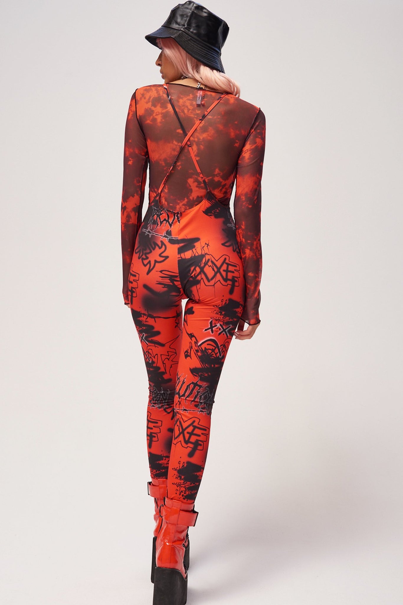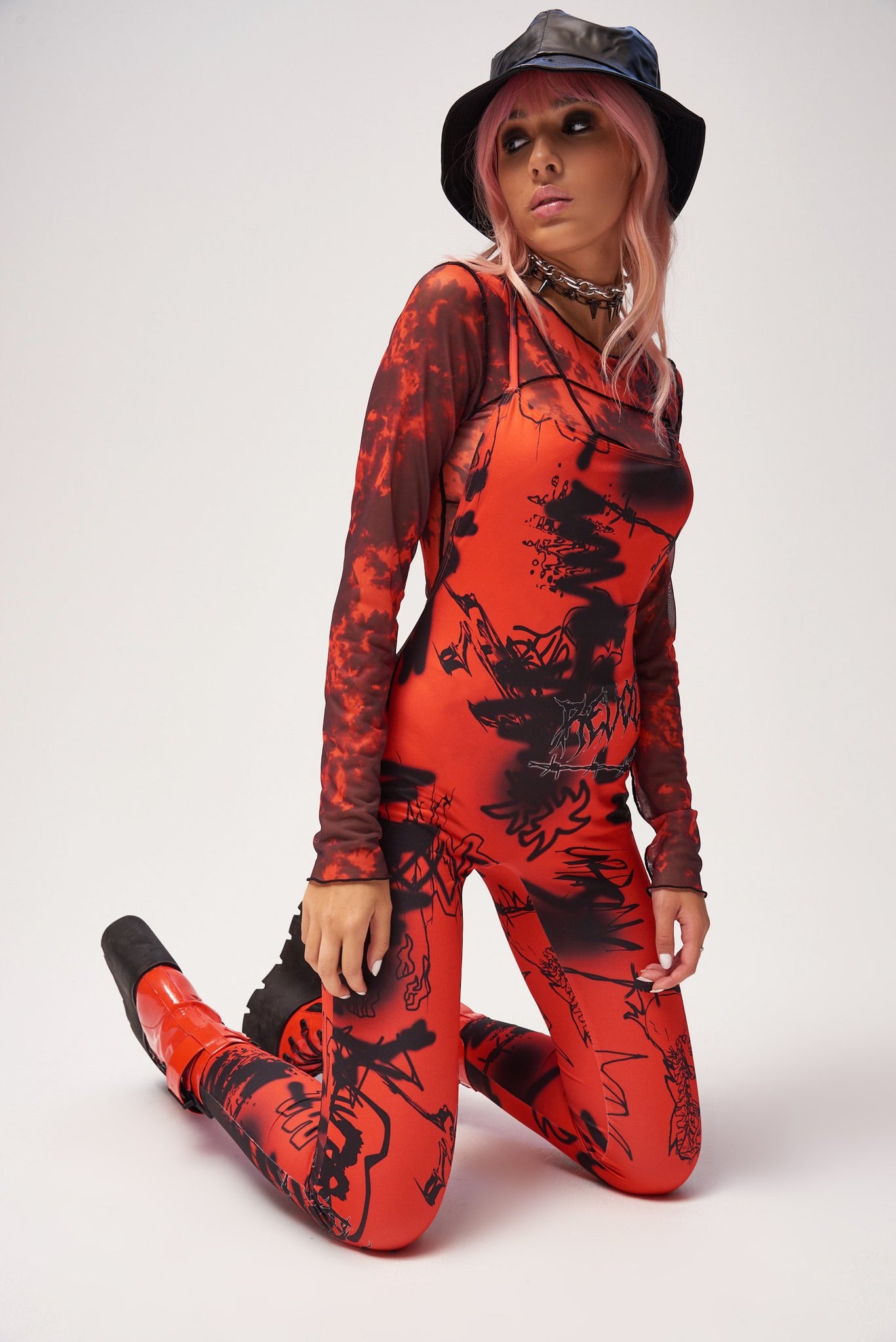 %text-1-start%Upgrade your wardrobe this season rocking out red & black graffiti print square neck catsuit!