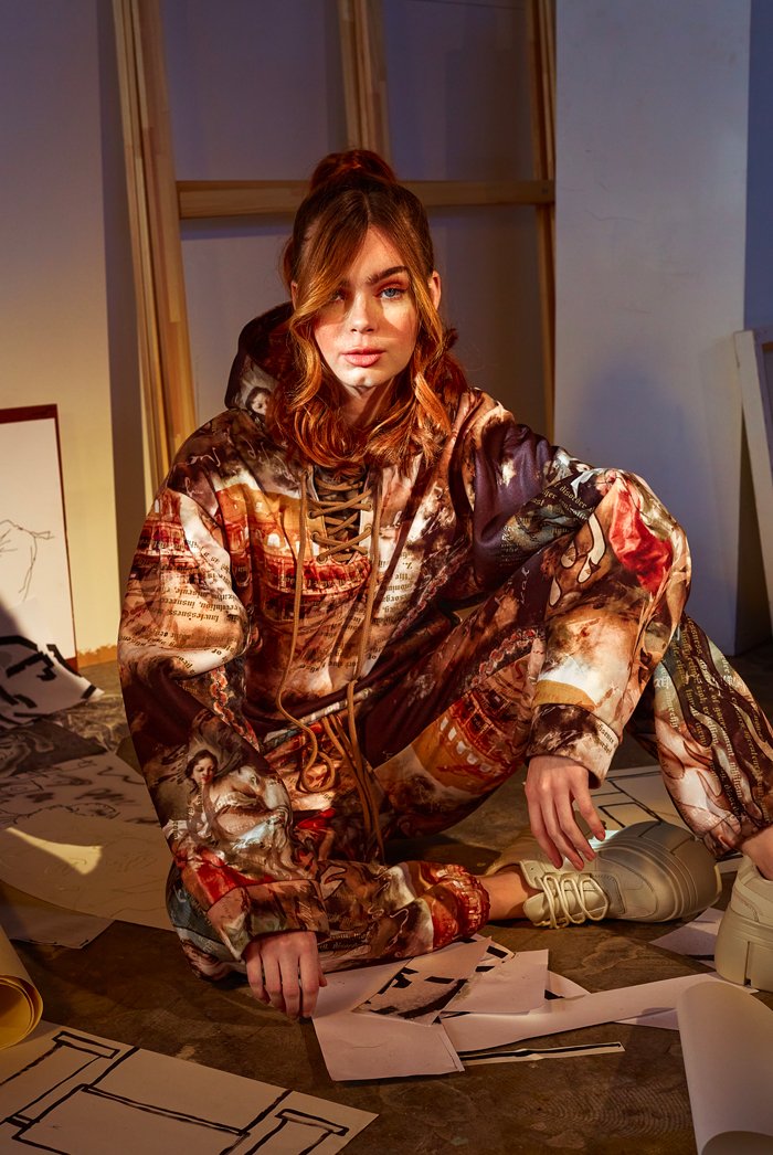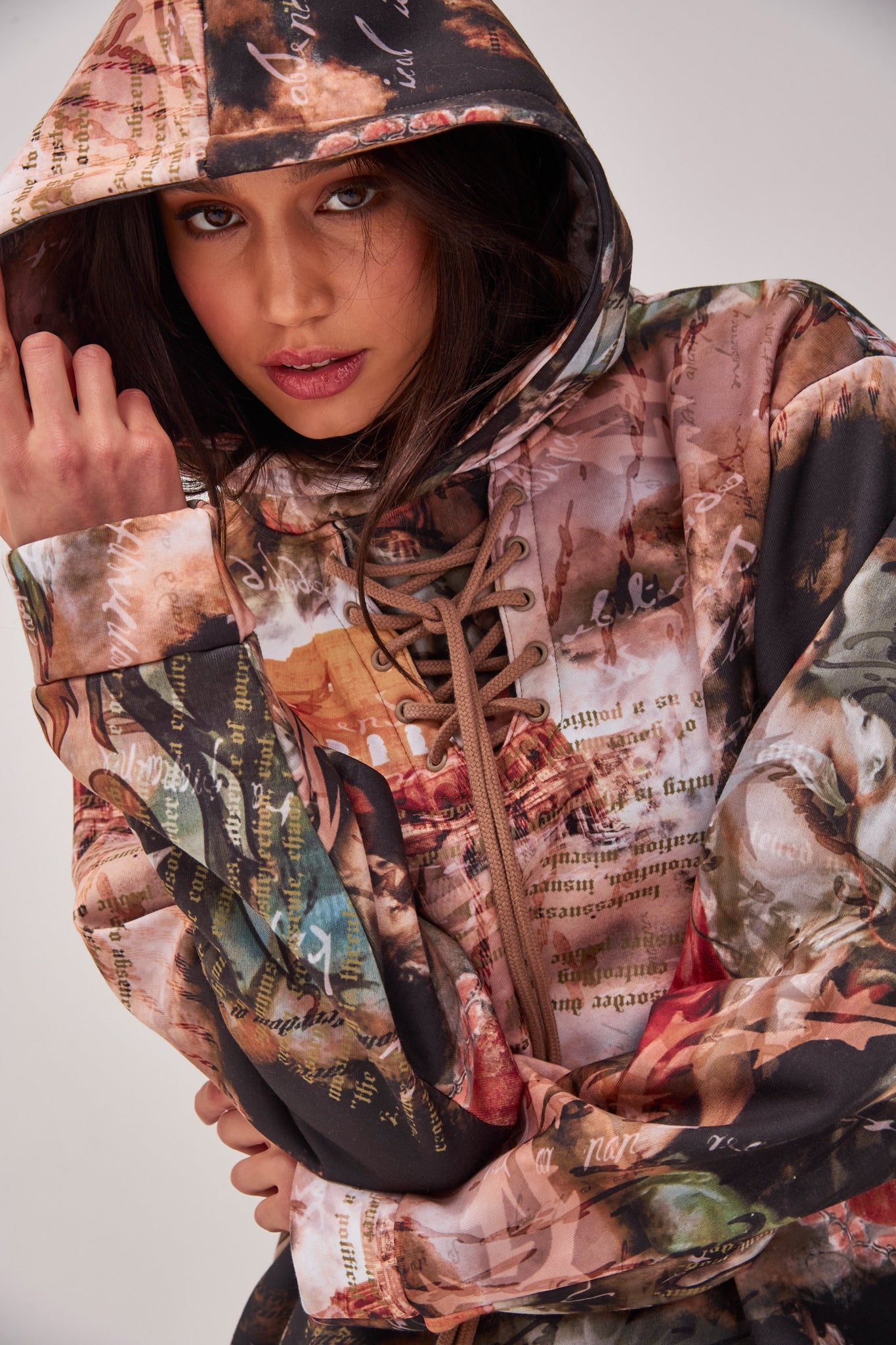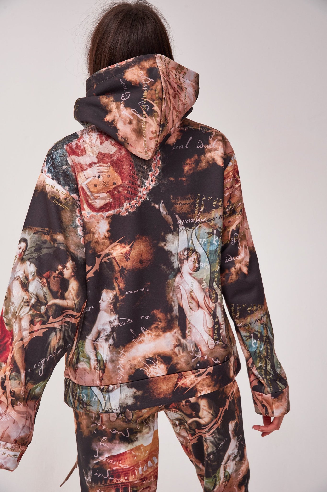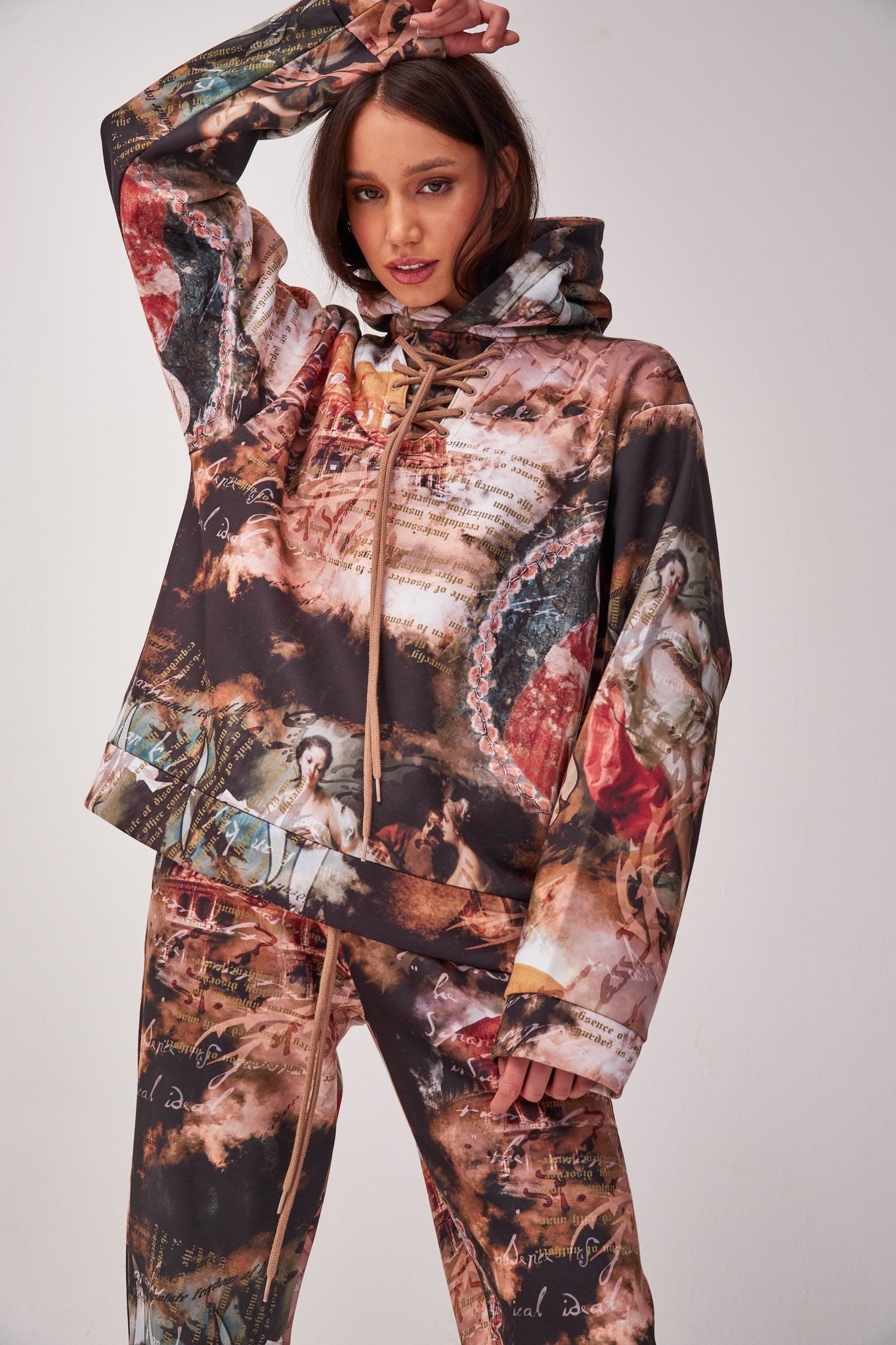 %text-1-start% Stay comfy in style this season rocking our renaissance script print hoodie, pair with the matching joggers!