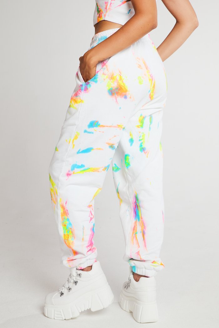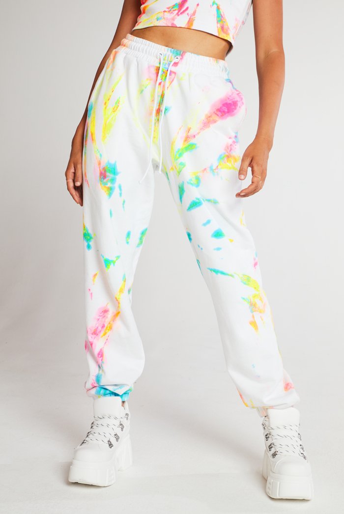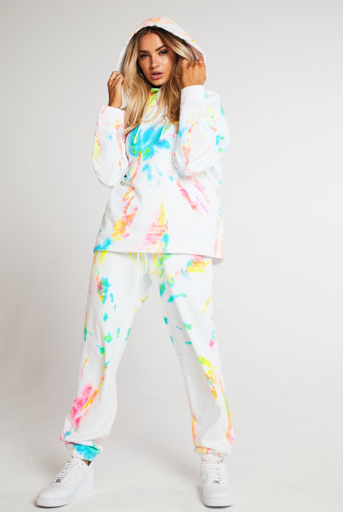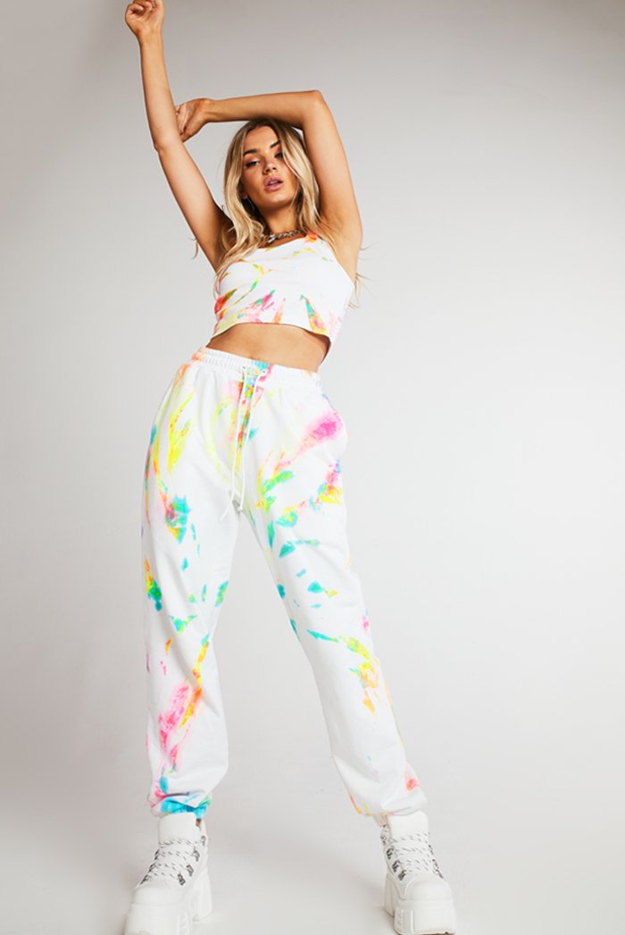 %text-1-start% Add some colour to your wardrobe this season rocking our reverse rainbow tie dye joggers! Pair with the matching hoodie & crop top for the ultimate co-ord.