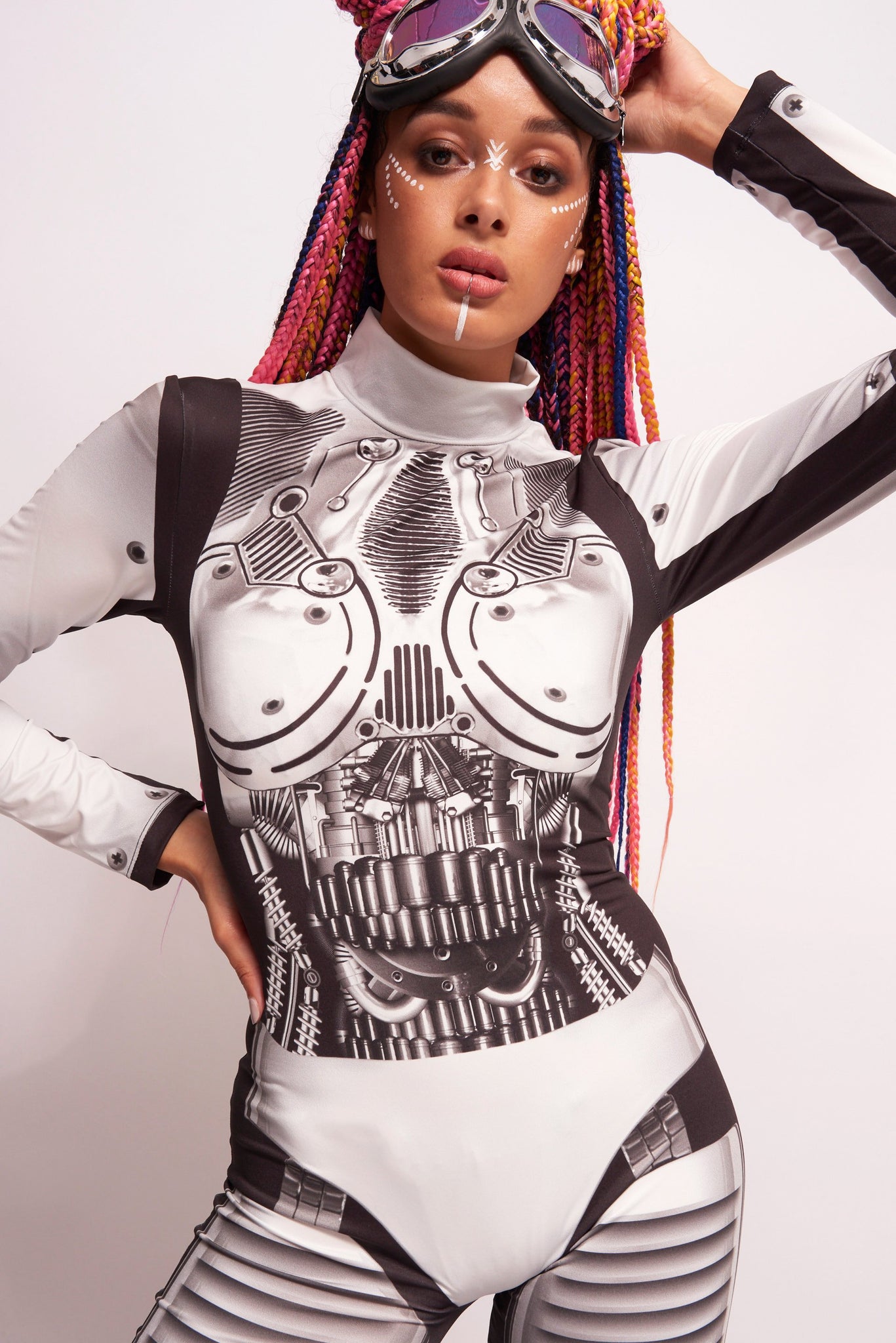 %text-1-start% Switch it up this season rocking our robot print long sleeve catsuit!