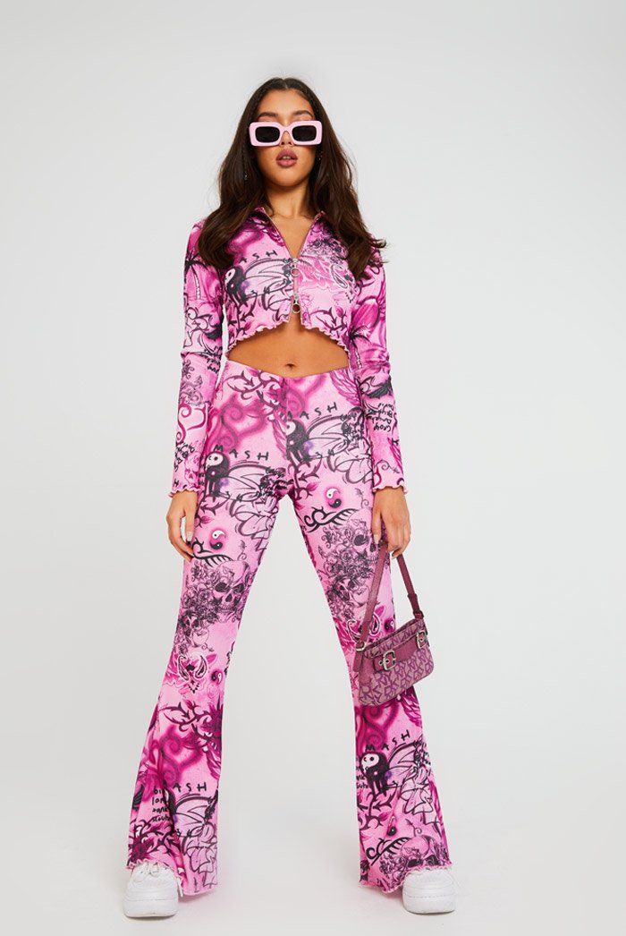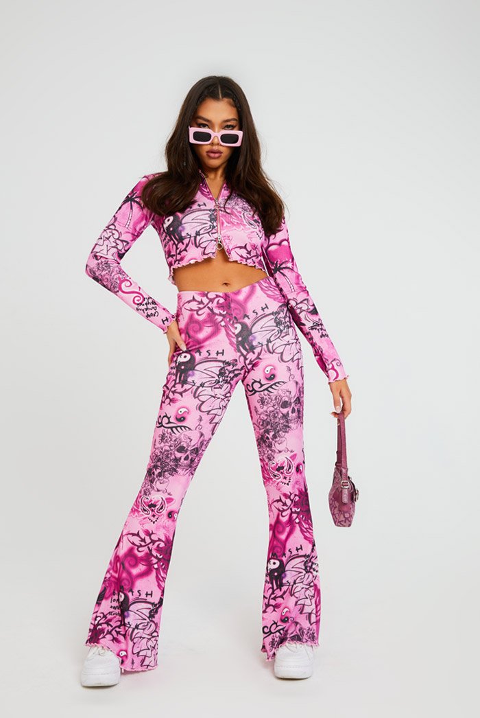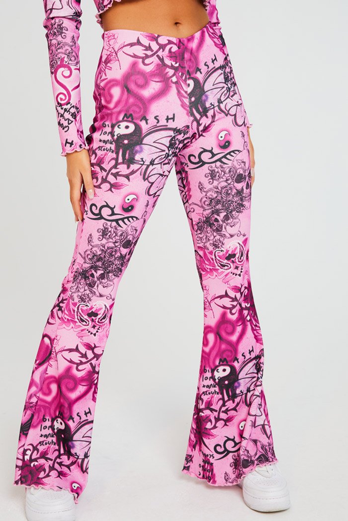 %text-1-start%Upgrade your wardrobe this season & stay comfy in style rocking our scribble print rib flare trousers!