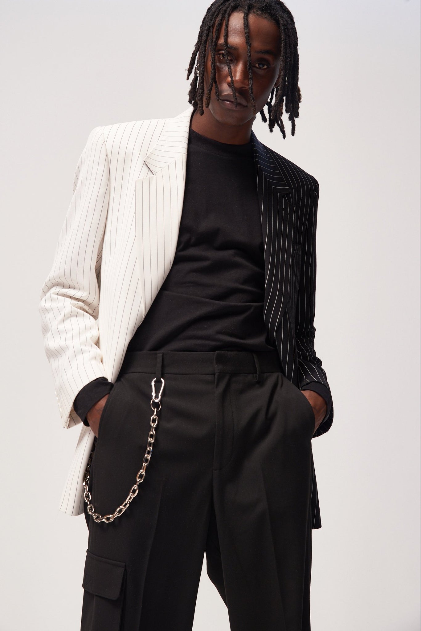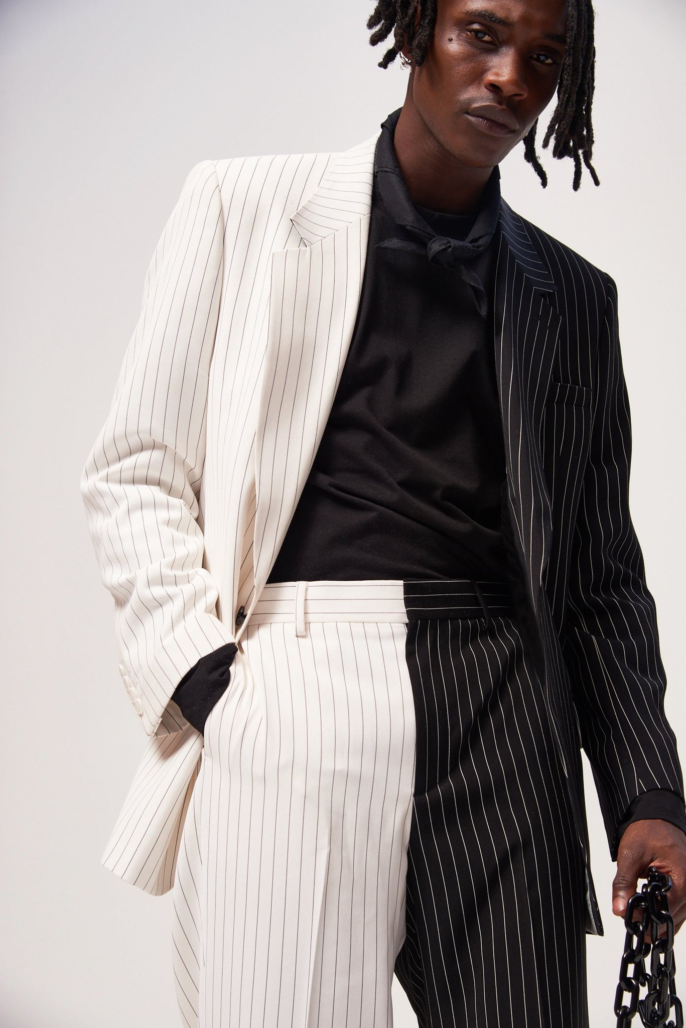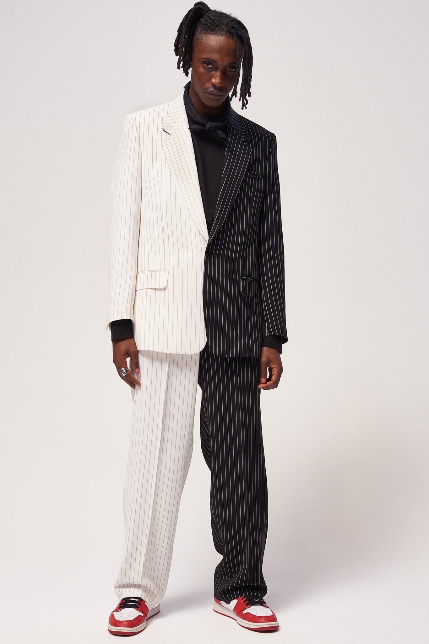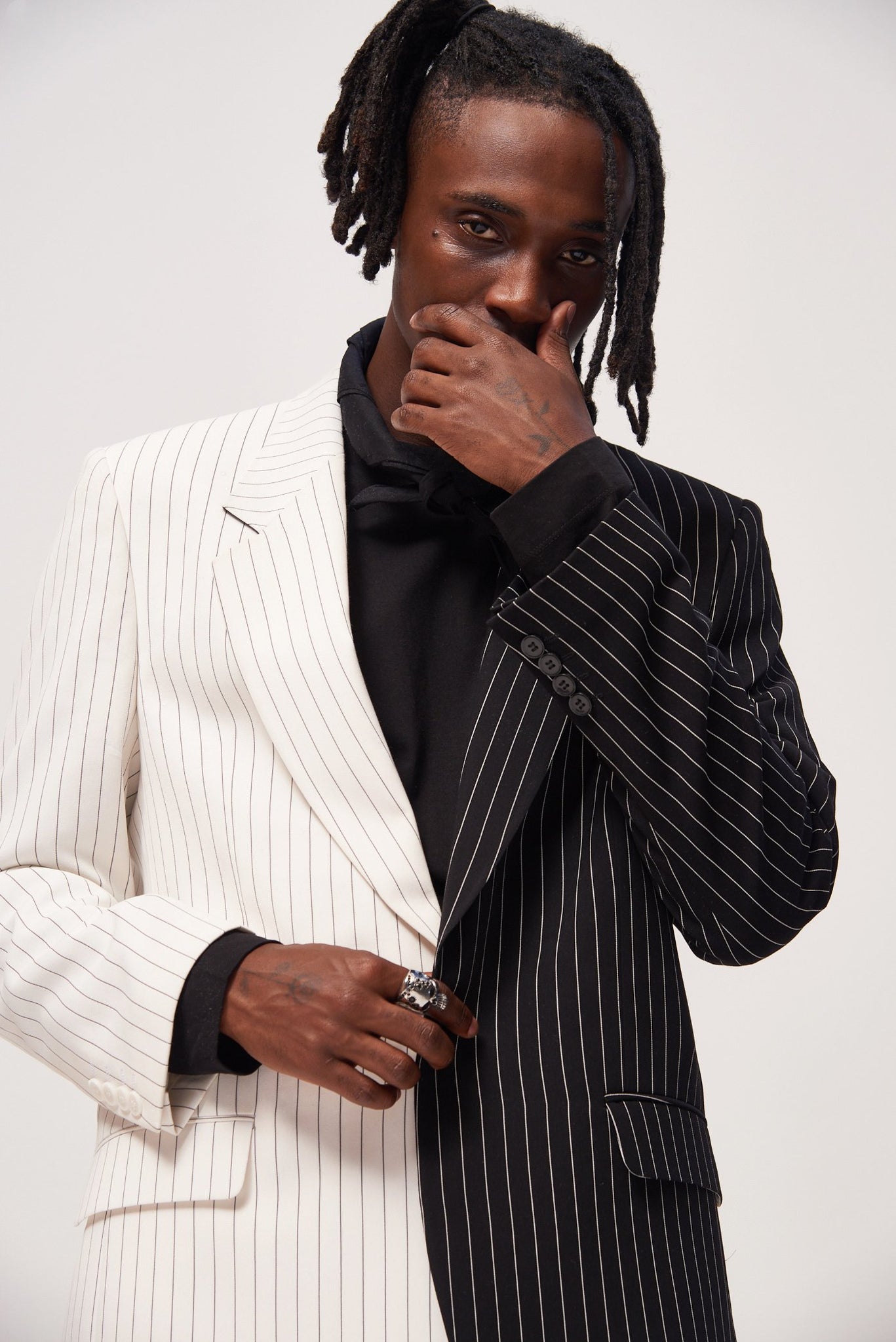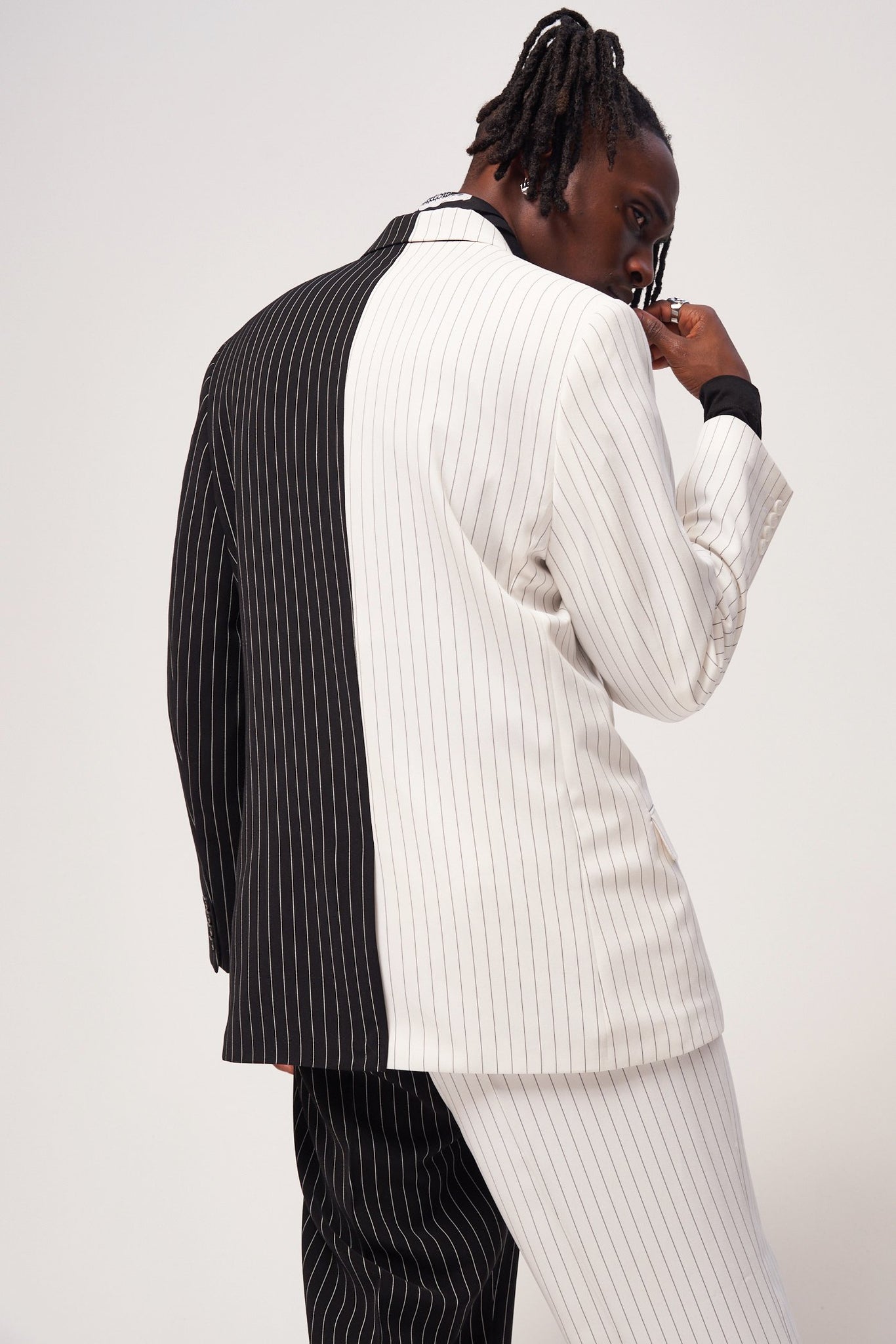 %text-1-start%Spliced Black & White Pinstripe Blazer