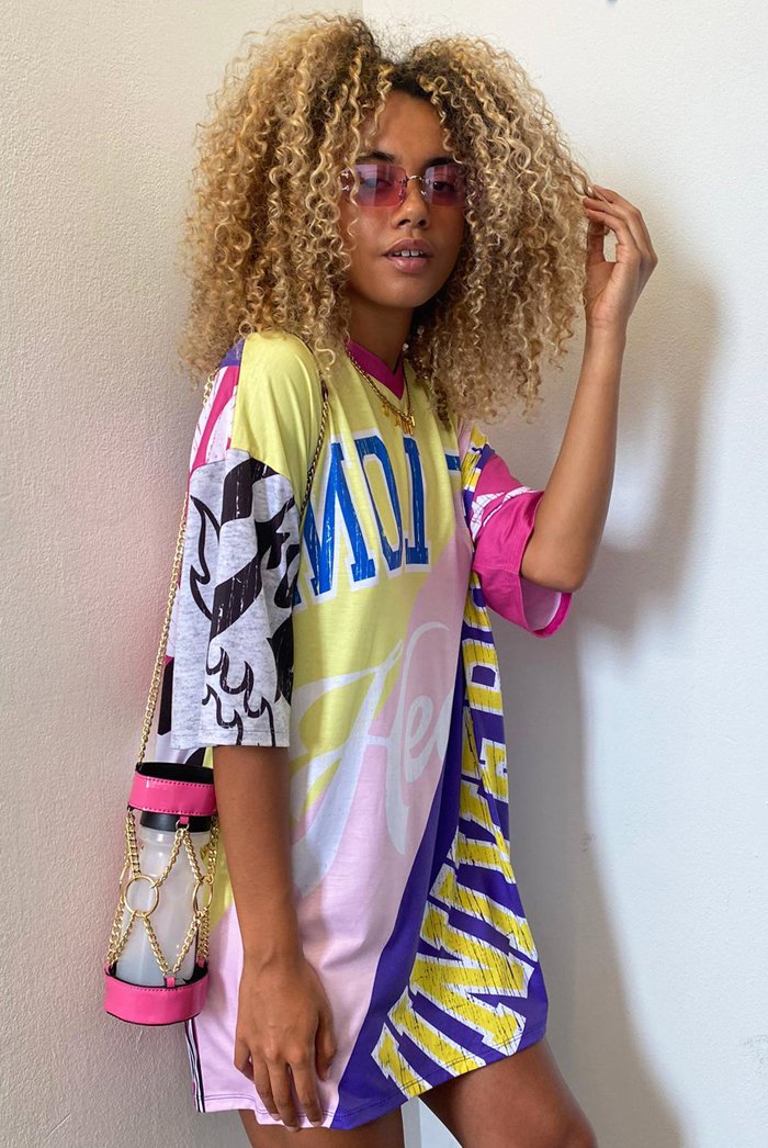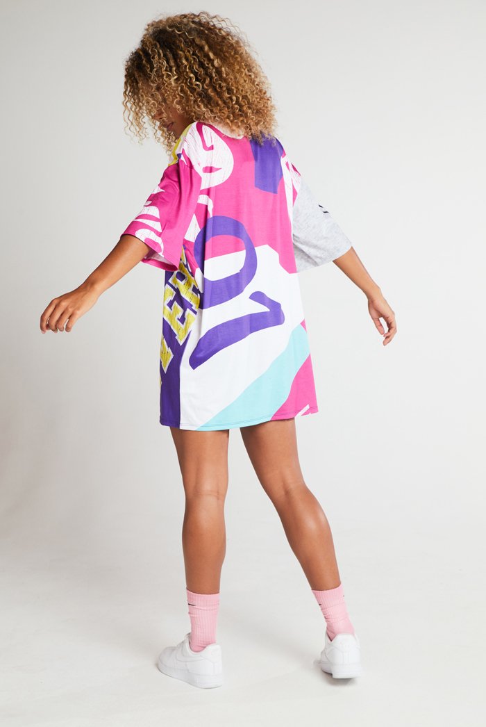 %text-1-start%Upgrade your wardrobe this season rocking our spliced mash up print oversized t-shirt dress!