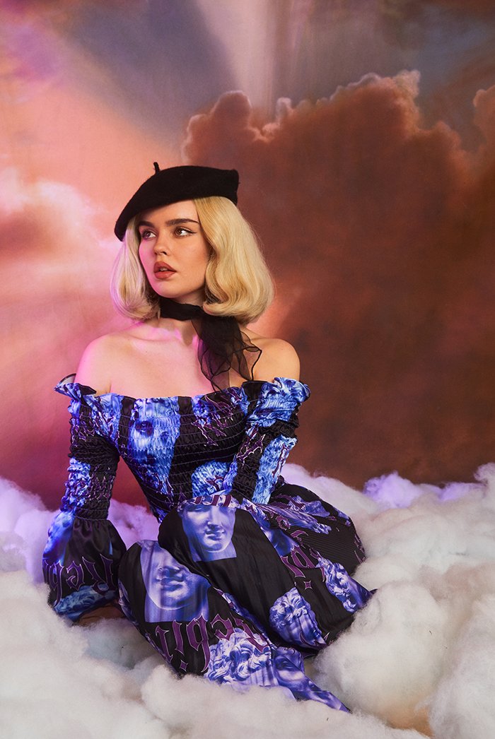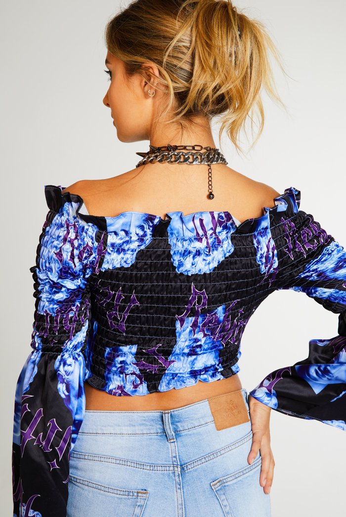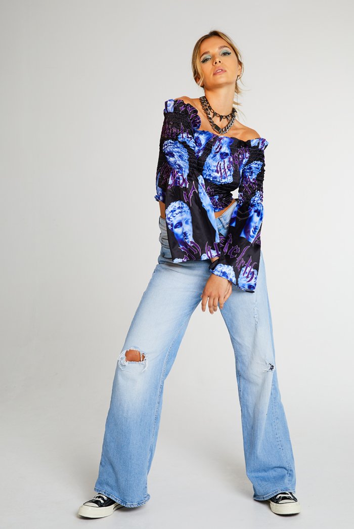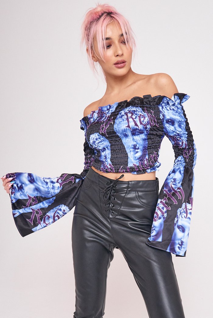 %text-1-start% Upgrade your wardrobe this season rocking our statue print shirred bardot top. Pair with the matching plisse trousers for a kick-ass co-ord!