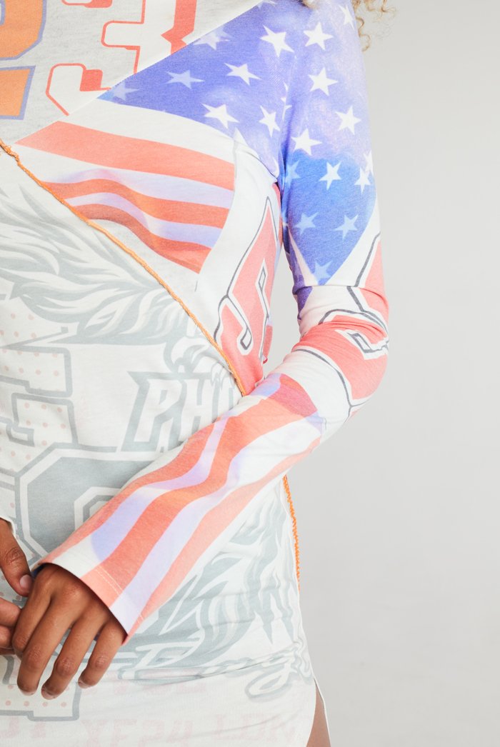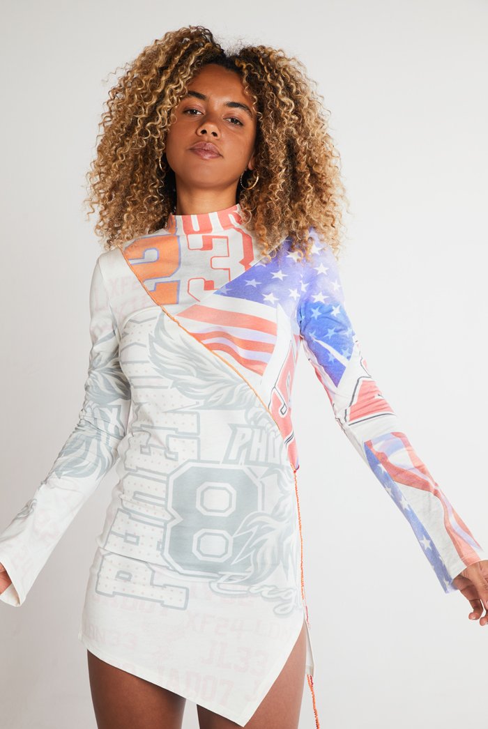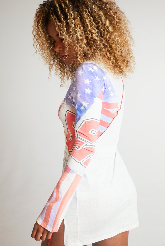 %text-1-start%Upgrade your wardrobe this season rocking our super cute varsity flag print cut & sew long sleeve jersey dress!